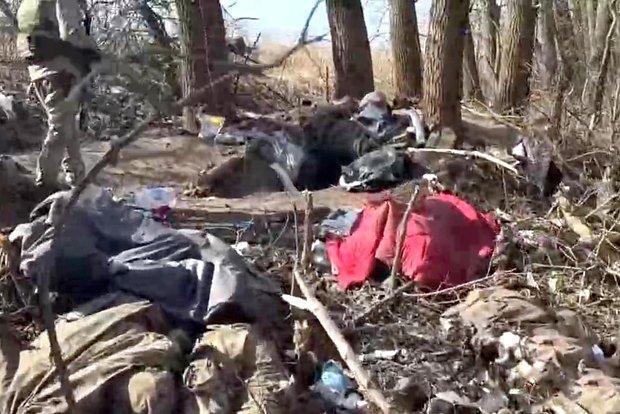 В кадре видны груды тел, хаотично разбросанных среди воронок и перепаханной техникой земли. На одном из участков внимание привлекает свежее захоронение: в рыхлый грунт воткнут шест с обрывком желтой ленты — возможная попытка маркировки могилы.