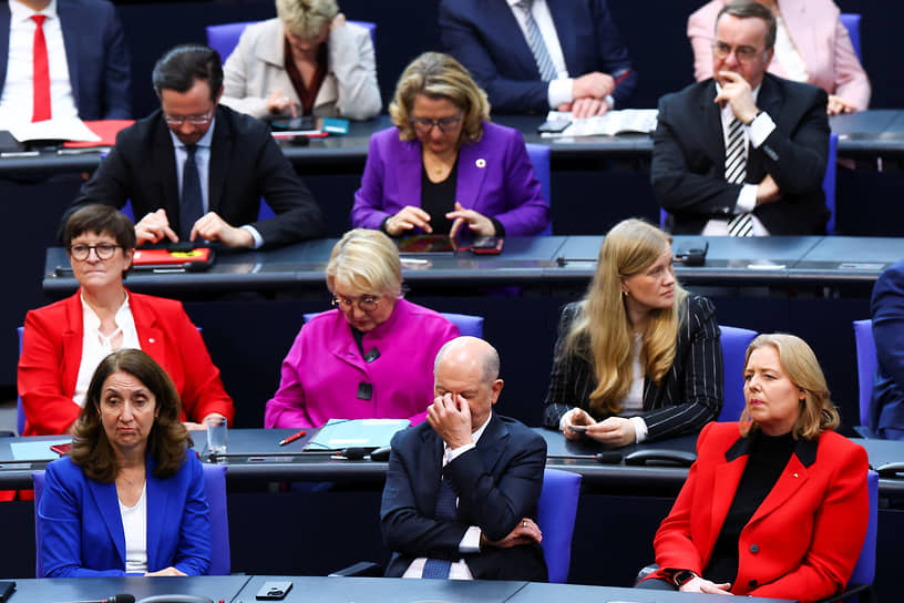 Канцлер Германии Олаф Шольц (в центре в первом ряду) и председатель Бундестага Бербель Бас (справа от Шольца) на первом заседании Бундестага нового созыва