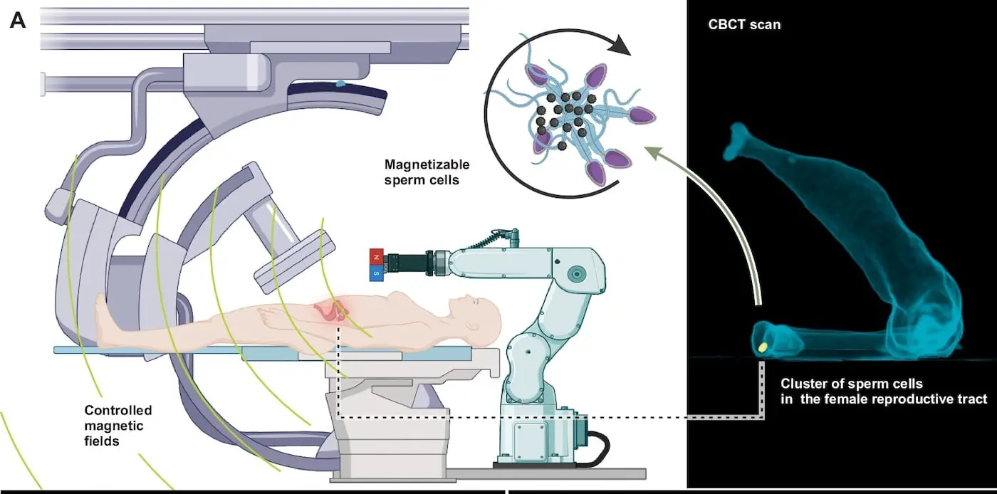 Для движения и навигации гибридных кластеров использовался сложный манипулятор с постоянным магнитом. Он формирует вращающееся магнитное поле, благодаря чему группа связанных сперматозоидов аккуратно катится по внутренним каналам модели — от шейки и через полость матки, до маточных труб. Такой подход впервые позволяет совместить четкое управление микророботами и их наблюдение рентгеном в реальном времени, что является настоящим техническим прорывом.