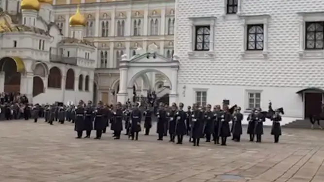 Несколько сотен зрителей собрались на Соборной площади Кремля, чтобы стать свидетелями заключительной в 2025 году церемонии развода пеших и конных караулов. Ровно в полдень торжественное действо началось под величественные звуки Президентского оркестра.