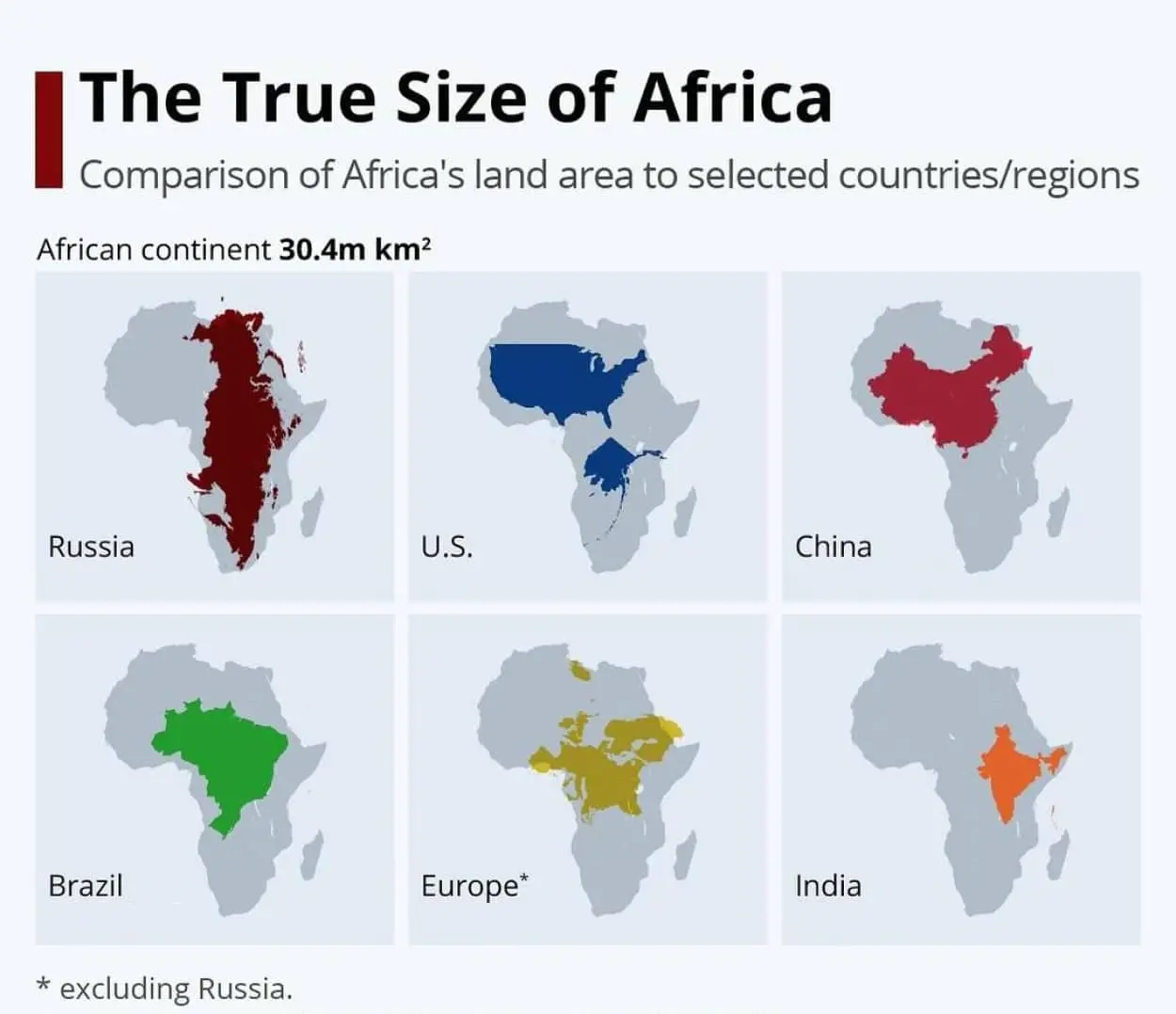 Масштабы Африки настолько велики, что на её землях можно было бы легко разместить более пяти условных Европ (площадью 5,9 млн км² каждая), если исключить её российскую часть.